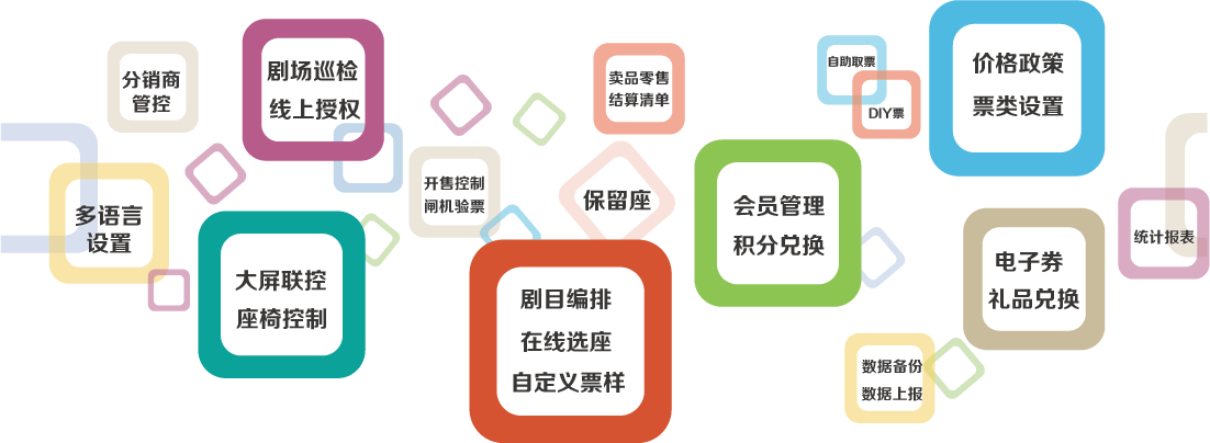 所有功能统一风格,在人性化设计的基础上,提供个性化设置。采用简洁的用户界面,便捷的操作方式,使您不必花费宝贵的时间来学习如何使用云平台。它涉及到二维码数字票制作,柜台售票、线上售票、电话订票、自助售取票、自动验票、大数据分析及财务记账等。为客户提供多渠道购票,从预订、选座、购票、付款、出票一条龙服务,为剧院提供一套便捷、高效、安全的现代化服务窗口。